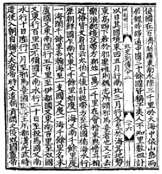 □俀國,在百濟、新羅東南,水陸三千里於大海之中依山島而居。魏時,譯通中國三十餘國,皆自稱王。夷人不知里數,但計以日。其國境東西五月行,南北三月行,各至於海。其地勢東高西下、都於邪靡堆,則『魏志』所謂邪馬臺者也。古云去樂浪郡境及帶方郡並一萬二千里,在會稽之東,與儋耳相近。漢光武時,遣使入朝,自稱大夫。安帝時,又遣使朝貢,謂之俀奴國。(以下略)