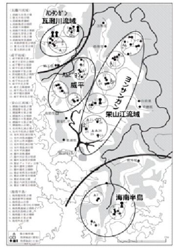 近年、韓国の旧百済南西部、厳密には栄山江流域(光州市・羅州市・木浦市一帯)、咸平地域、瓦灘川流域、海南半島地域(図1)に、十七基にのぼる前方後円墳が発見された。そして、それらの古墳は「平面長方形で平天井を呈し、立柱石と腰石を配する形態で、時には石室に赤色顔料の塗布が確認される横穴式石室を有する」という「九州様式の前方後円墳」だった。そして、概ね「倭の五王」の時代の五世紀後半~末の造営で、六世紀当初には一斉に造営が止み、韓国の考古学者も「これらの前方後円墳は五世紀末頃~六世紀初頭に北部九州の勢力が造ったと考えられる」(朴天秀論文①・注4)、あるいは「北部九州地域から百済の栄山江流域へ影響を与え、九州系横穴式石室が出現した」(崔榮柱・注5)としている。