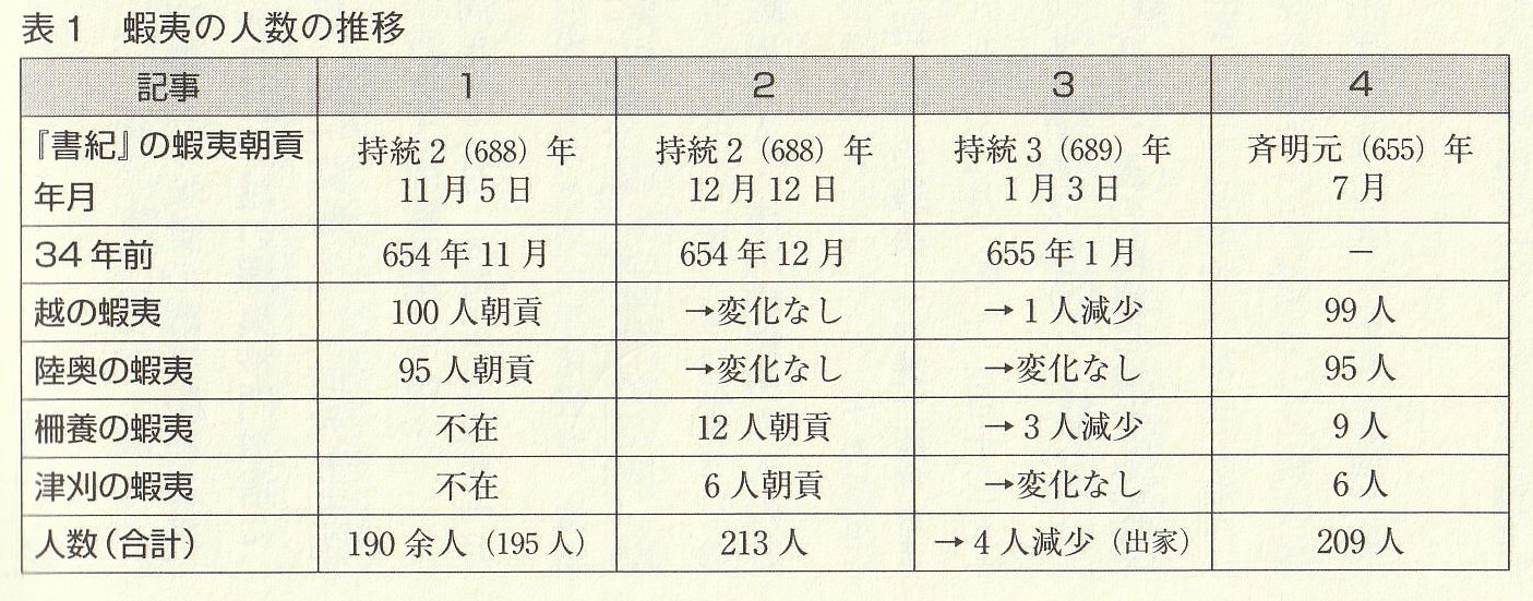 一方、持統二年(六八八)十一月から三年(六八九)一月三日記事に、多数の蝦夷の朝貢と出家記事がある。