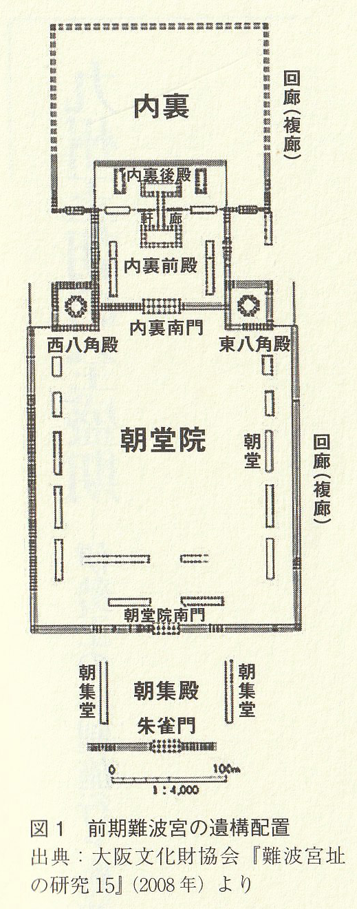 現在では大阪市文化財協会などによる発掘調査も進み、北区画(東西一八五m、南北二〇〇m以上)には内裏・内裏後殿が、南区画(東西二三三m、南北二六三m)には回廊(廊下を持つ複廊)に囲まれた十四もしくは十六棟の朝堂院が存在し、この二区画を二棟の八角殿と内裏南門で区画された内裏南区画(東西一一四m、南北八十四m)が繋ぐという、『書紀』記事通りの壮大な宮であったことが確認されている(図1)。さらに、宮の北西部の谷から出土した戊申年(六四八)木簡や、柱列の年代等(注3)から、『書紀』に記す「六五二年」という完成年次に齟齬はないと考えられている。