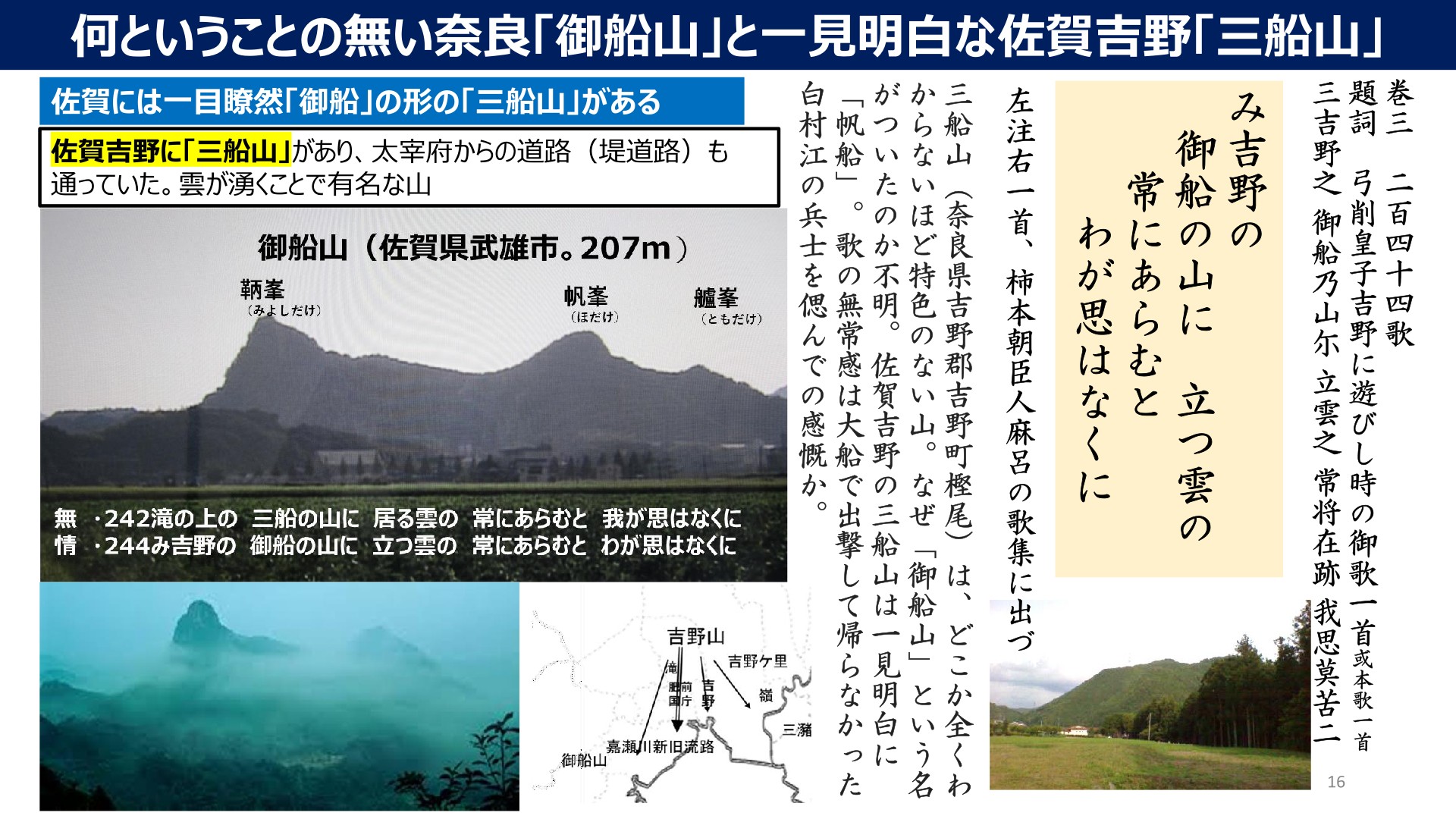対して九州佐賀県の吉野には、吉野ヶ里の「吉野」もあり、二百四十四歌の「み吉野の三船の山」とわかる「御船山」(佐賀県武雄市207m)があります。この山は見るからに、帆船そのもの形状の山です。鞆峰(みよしだけ)、帆峰(ほだけ)、艫峰(ともだけ)と呼ばれています。一見して「三船の山」で、いつも雲が立っています。特に朝は。