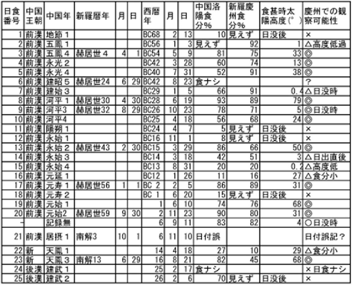そこで、前項で述べた新羅初代王・赫居世の治世を含むBC六八年からAD二六年までに起きた中国と新羅で記録された二十五回の日食について、新羅の首都・慶州における各日食の見え方をまとめたものが表1である。
