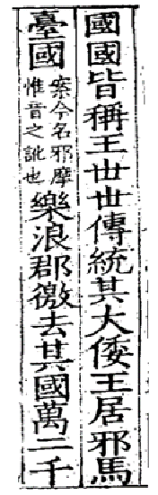 □其大倭王居邪馬台國[案今名邪摩惟音之訛也]。樂浪郡徼,去其國萬二千里,去其西北界拘邪韓國七千餘里。其地大較在會稽東冶之東,與朱崖、儋耳相近,故其法俗多同。