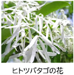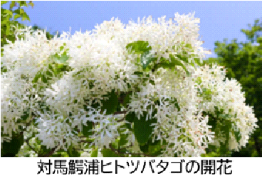 ヒトツバタゴ(別名ウミテラシ・ナタオラシ・ミズイシ、俗名なんじゃもんじゃ)はモクセイ科の大陸系植物で、古代より大陸への窓口であった対馬を象徴する植物として、対馬市の木に指定されている。また昭和三年に 国の天然記念物にもなっている。