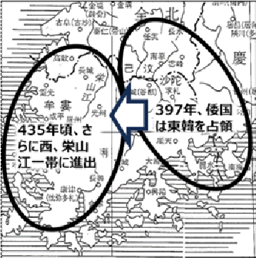 ⑤倭国は百済が高句麗に臣従したのを見て、三九七年に東韓一帯(百済南東部)を占領。百済は改めて倭国に臣従し、直支(後の腆支王)を倭国に出す。