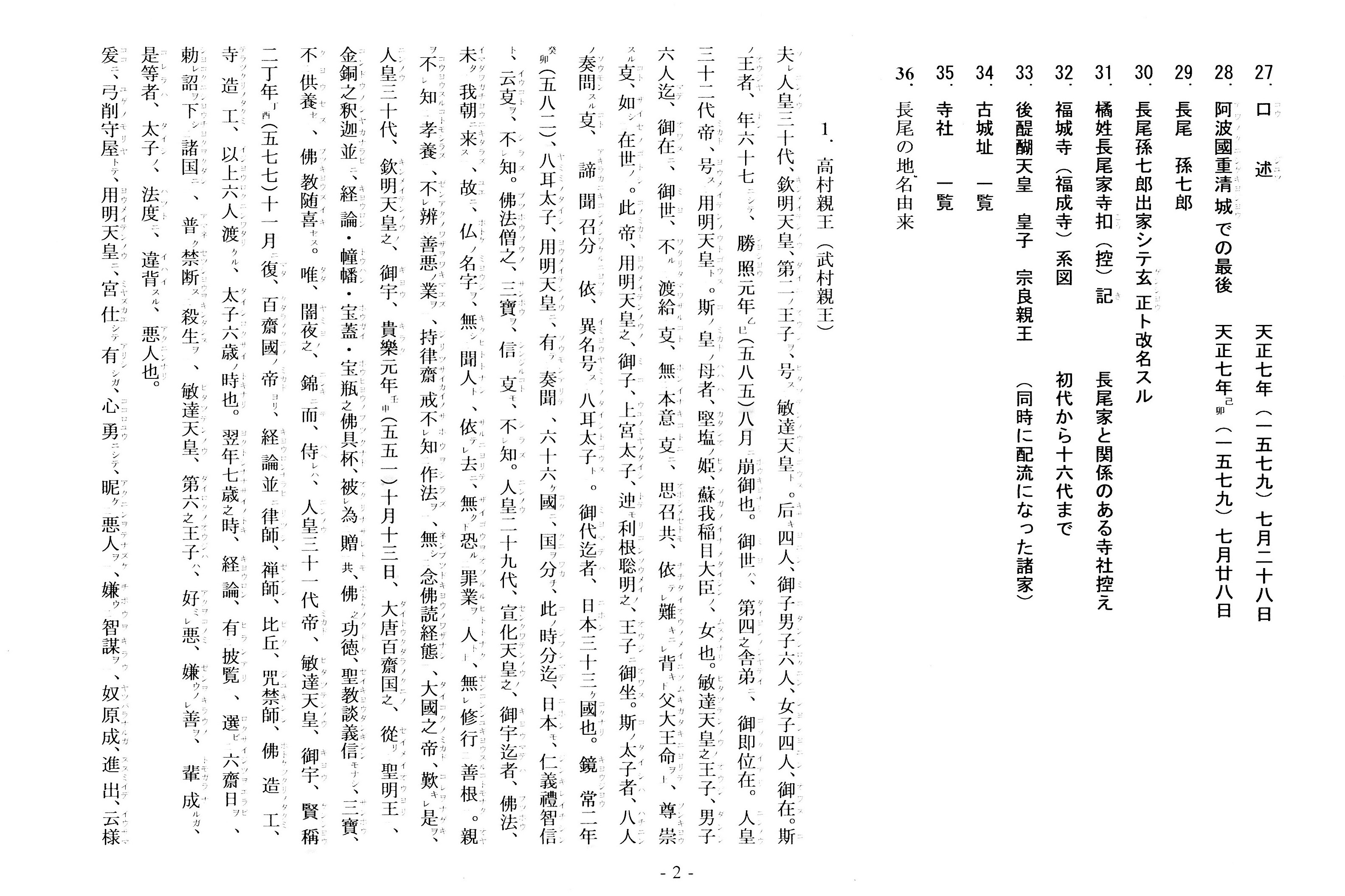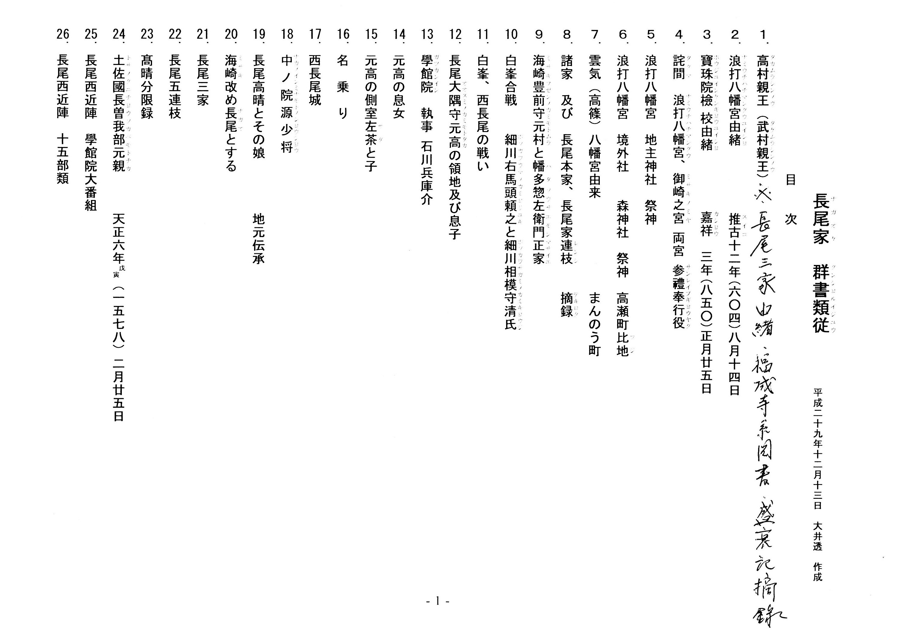写真の史料は『長尾家群書類従』(平成二十九年、大井透氏作成)の最初の三ページであり、長尾家に伝わる原文史料そのものではないことをお断りしておく。目次「1.高村親王(武村親王)」の項目が九州年号記事を含む「長尾三家由緒・福成寺系図書・盛衰記」の摘録である。編集の段階でカッコ書きの西暦や読み仮名等が書き加えられており、西暦への変換において、やや疑問とされる年号も見受けられる。
