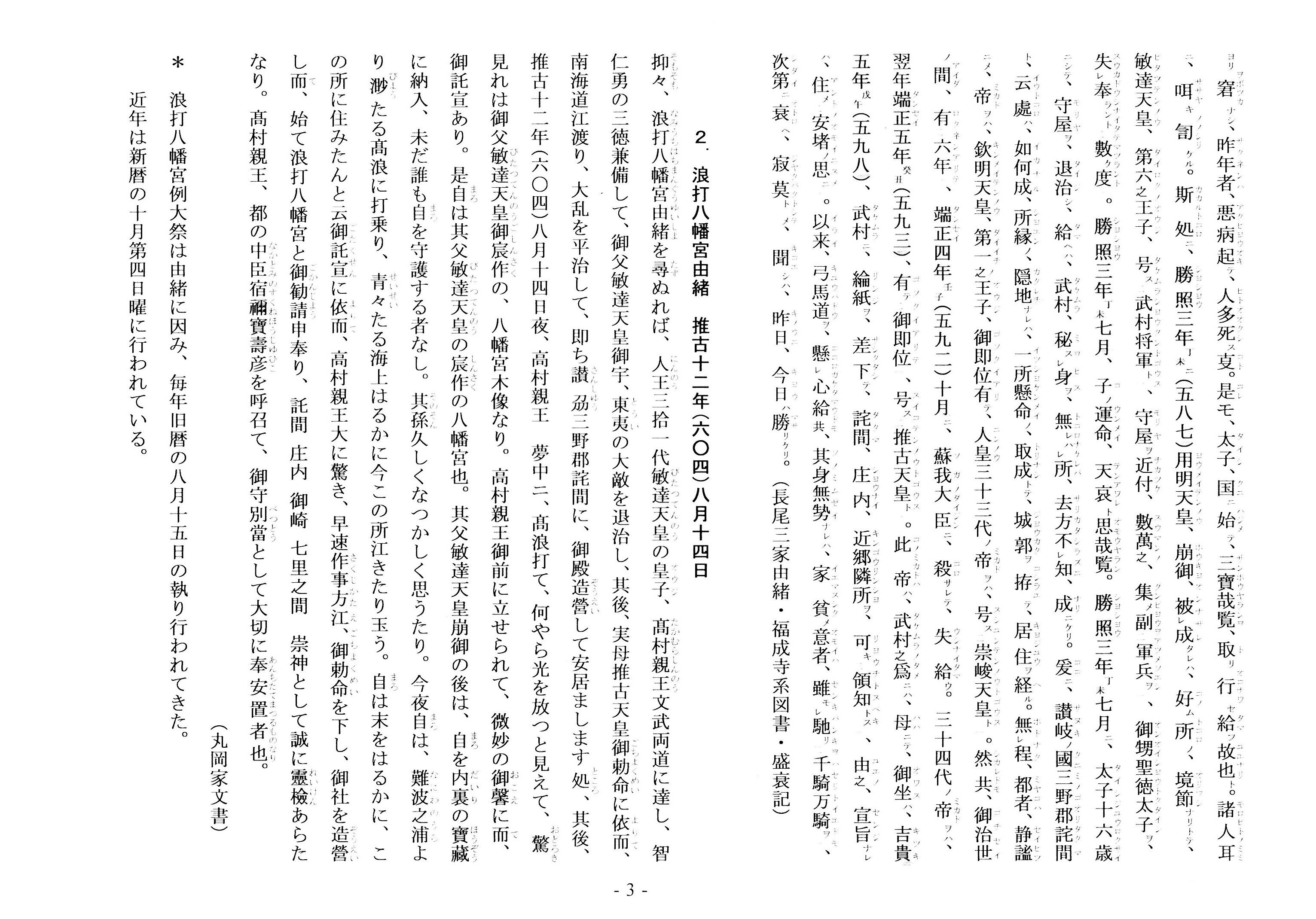 香川県の浪打八幡宮(三豊市宅間町宅間)創祀者高村親王(註1)後裔とされる南海道学館院別当長尾家の「長尾三家由緒」に、六種類十個の九州年号記事の記載がある(註2)。西讃地方にこのような史料が眠っていたことは驚きであり、情報提供及び史料送付して下さった香川県在住の大井透氏に深く感謝したい。送られた史料をもとに、現時点において理解の及ぶ範囲で報告させていただく。十分な史料批判ができているわけではない段階であり、今回は九州年号史料の存在をお伝えするに留め、今後の研究課題とするとともに、その扱いには十分注意をしてほしい。