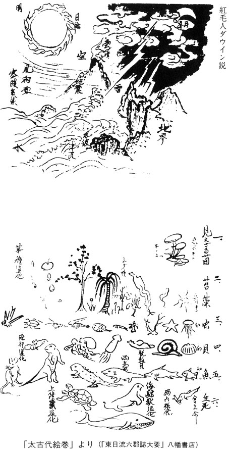 地界の成れる創ぞ、陸起陸没にて、海陸固定せず、海とて底より火泥煙灰を噴じ、陸地なるは至る処、泥火流れ噴火落雷に騒音し、やがて陸海固定しけるに、生物水中に誕生せり。是れぞ万物生長の創にて目に見えざる菌を以て生誕し、次に苔、藻なり。