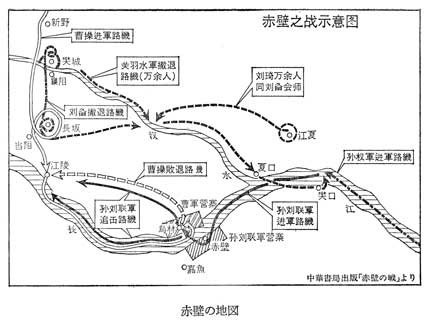 『古戦場の赤壁の所在地には二説あって、一説は今の湖北省蒲圻(ほき)県の西北にある長江(ちょうこう)南岸赤壁山である。山壁には今も「赤壁」の二字を刻んだ石がある。いま一つは同じ湖北省の嘉魚(かぎょ)県東北にある赤磯山である。宋の詩人蘇軾(そしょく)は黄岡(こうこう)西北の赤鼻山を赤壁と勘違いして、そこに有名な「赤壁賦」の詩を書きしるしている』