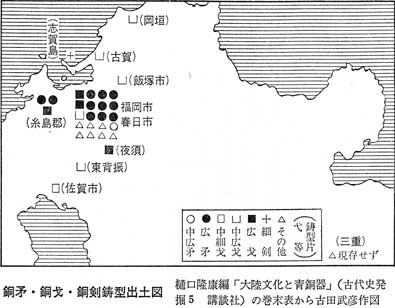 これに対して、一つの言葉を使いますと、私は「権力者の意志」を感じたんです。つまり材料的にも技術的にもつくれるだろう。しかし一定の地域以外ではつくらせない、という「権力の意志」が、そこに働いている。私にはそうとしか思えないのです。その「権力の意志」は圧倒的に博多湾岸を指し、次いで糸島郡です。それから特定の型によって許可しようというんでしょうか、それが点々と西は佐賀県、東は筑前東域にまたがっている、こういう形になっていると思うんです。そうしますと、権力者がここしか神聖な祭器はつくってはならない、といった土地は、神聖な土地である、それがすなわち首都圏だ、こう考えるわけです。